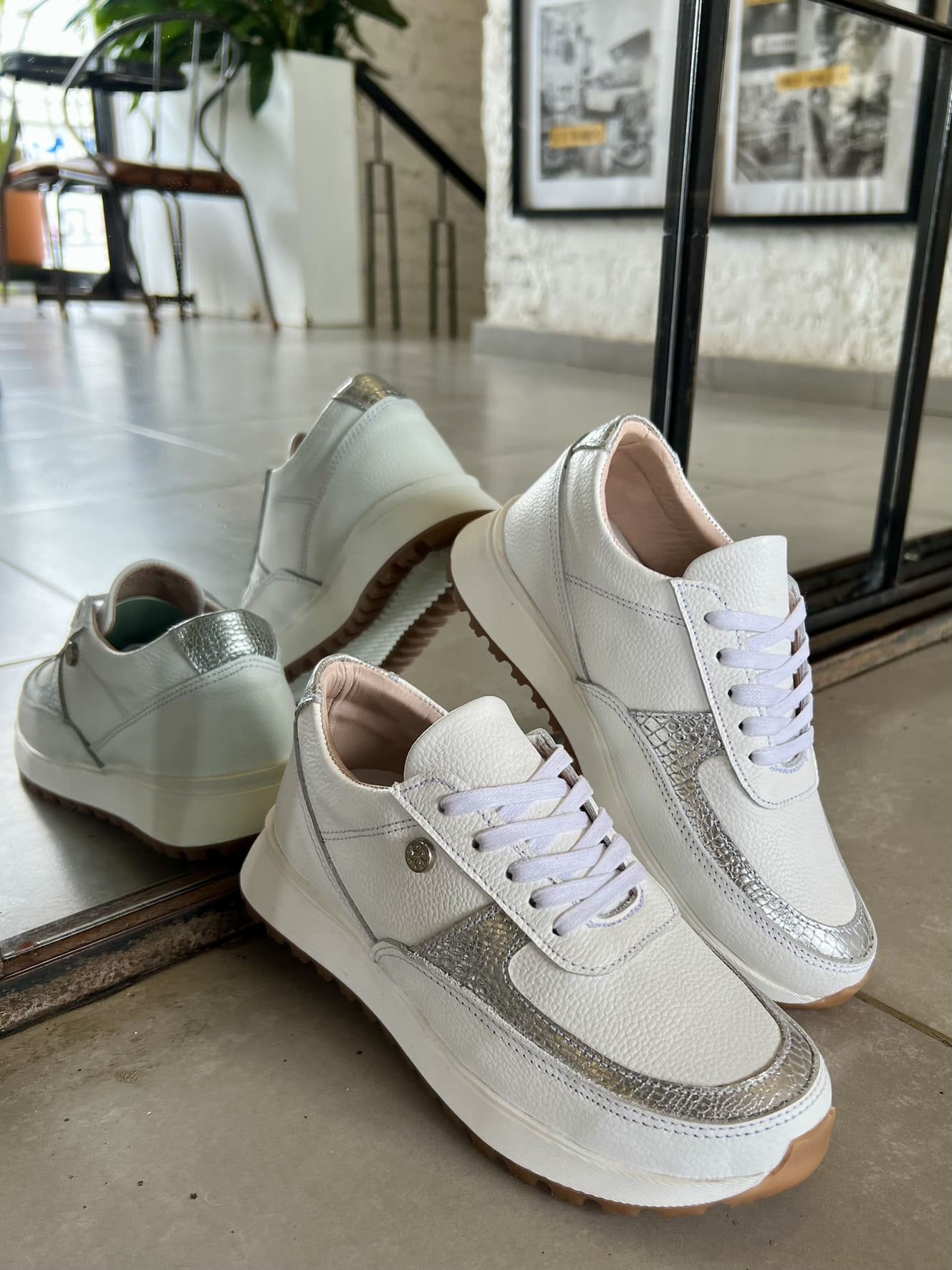 Estos tenis para mujer están fabricados 100% en cuero genuino, lo que garantiza durabilidad, elegancia y calidad superior frente a cualquier calzado sintético. Su diseño moderno combina detalles plateados con una base blanca que realza tu estilo en cualquier ocasión.